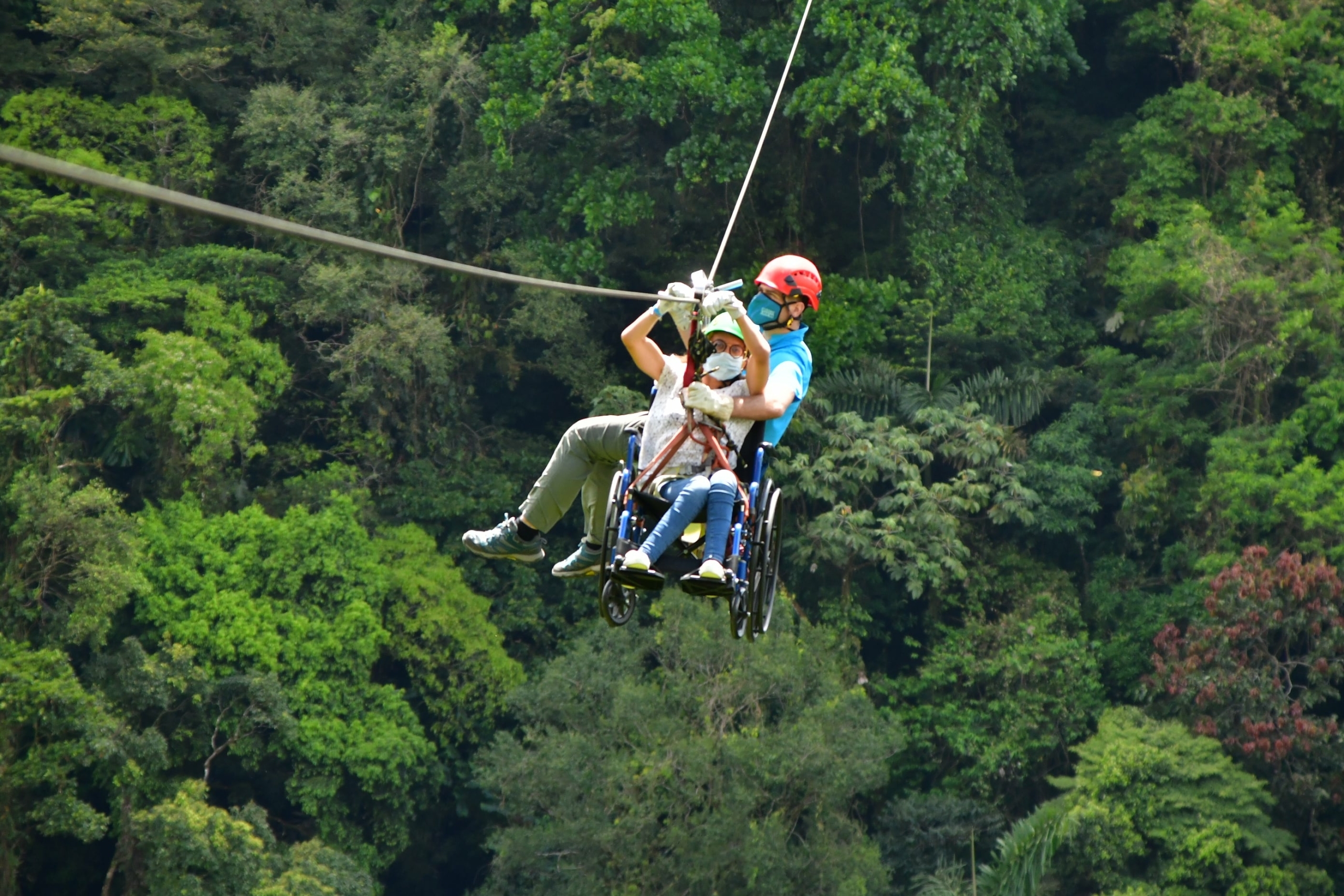 C’est assez simple en réalité ! On vous transfère sur un fauteuil roulant qui leur appartient, histoire de ne prendre aucun risque avec le vôtre, puis on vous attache solidement (et croyez-moi j’ai vérifié plusieurs fois !). Ensuite direction une télécabine qui vous amène au sommet pour le départ de la première tyrolienne. Au programme 6 tyroliennes sur 7 sont ainsi totalement accessibles. Pour ça de larges passerelles ont été réalisées au départ de chaque tyrolienne afin de pouvoir se positionner correctement. Ensuite un guide s’accroche à vous et c’est lui qui va contrôler la tyrolienne. En fait la personne en fauteuil doit juste tenir les poignées situées sur la poulie. Le clou du spectacle ? La dernière tyrolienne nécessitant l’utilisation d’un escalier en colimaçon pour y accéder, on rejoint le sol par… une descente en rappel qui vous suspend à 20m au-dessus du vide ! Cette expérience est dingue (si un jour on m’avait dit que je pourrais faire de la tyrolienne je n’y aurais pas cru !) et la vue sur le volcan et la forêt tropicale rend l’activité encore plus magique !