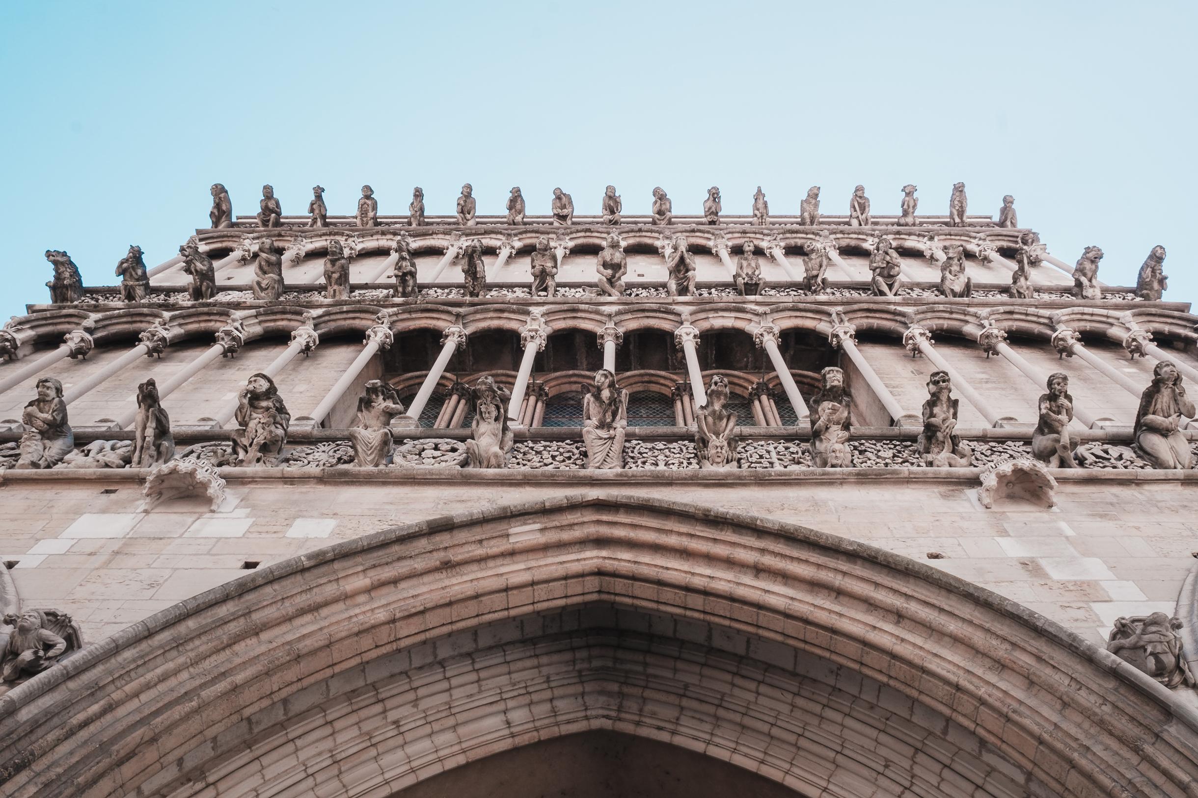 On continue en passant sous la porte Guillaume, érigée au 18ème siècle en l’honneur des Ducs de Bourgogne, marquant l’entrée ouest de la ville. C’est ici que commence le parcours de la Chouette, emblème de la ville. Si vous regardez au sol, vous ne pourrez pas rater ces petits triangles dorés qui vous guideront à travers les siècles. L’origine de ce symbole vient d’une statue en forme de chouette taillée sur la face nord de l’église Notre-Dame qui selon la légende porte chance dès qu’on la touche ! En passant devant, levez la tête pour apercevoir la famille du Jacquemart. Lui et sa femme frappent les heures tandis que leurs enfants frappent les quarts d’heure !