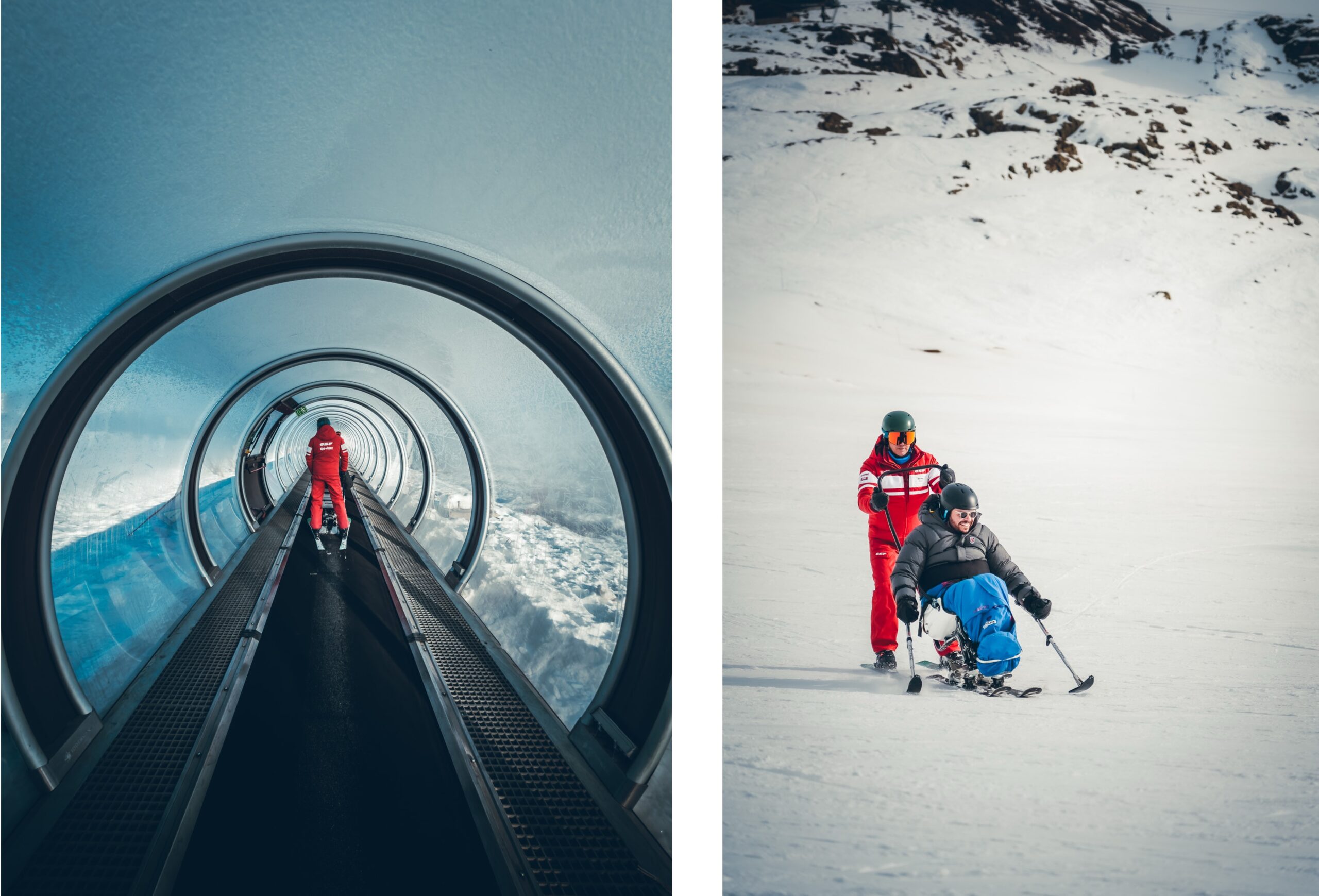 Aujourd’hui, l’objectif est de retrouver des sensations en dual ski. Arnaud m’aide à m’installer dans la coque, on emprunte une petite passerelle pour rejoindre la piste et c’est parti ! Durant un peu plus de deux heures, on enchaine les descentes sur des pistes vertes plus ou moins pentues. L’apprentissage se fait étape par étape : retrouver mon équilibre à l’aide des stabilo, réussir mes virages en gérant ma vitesse.